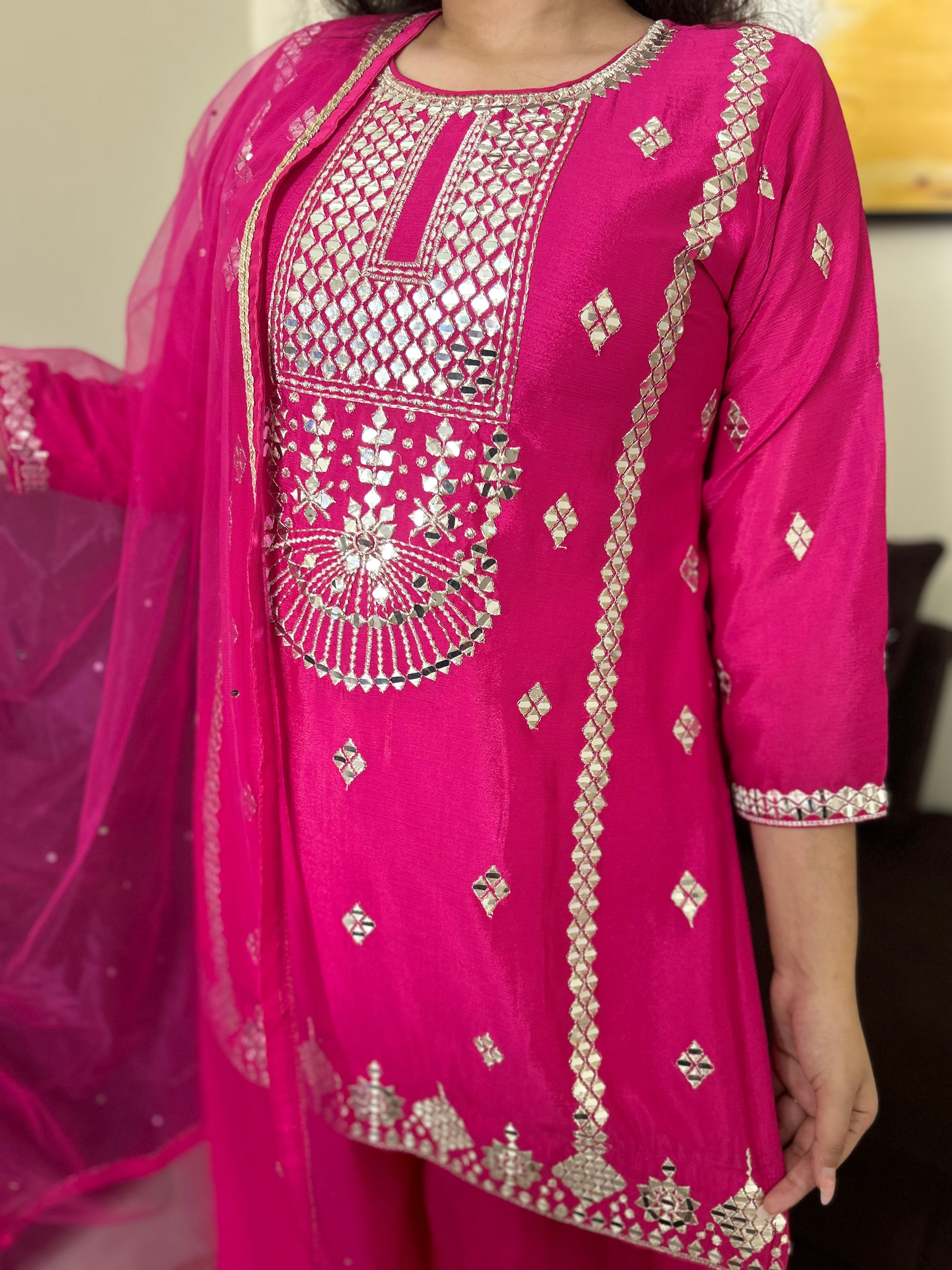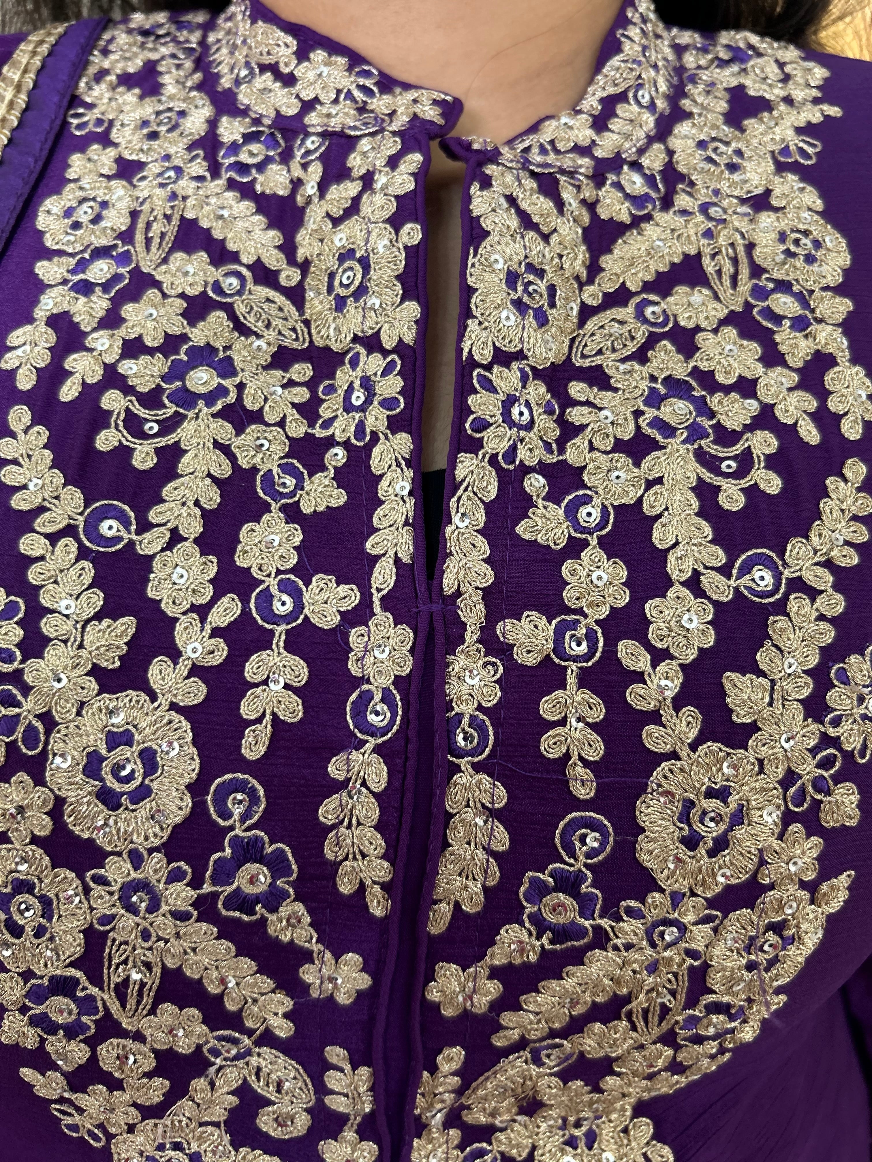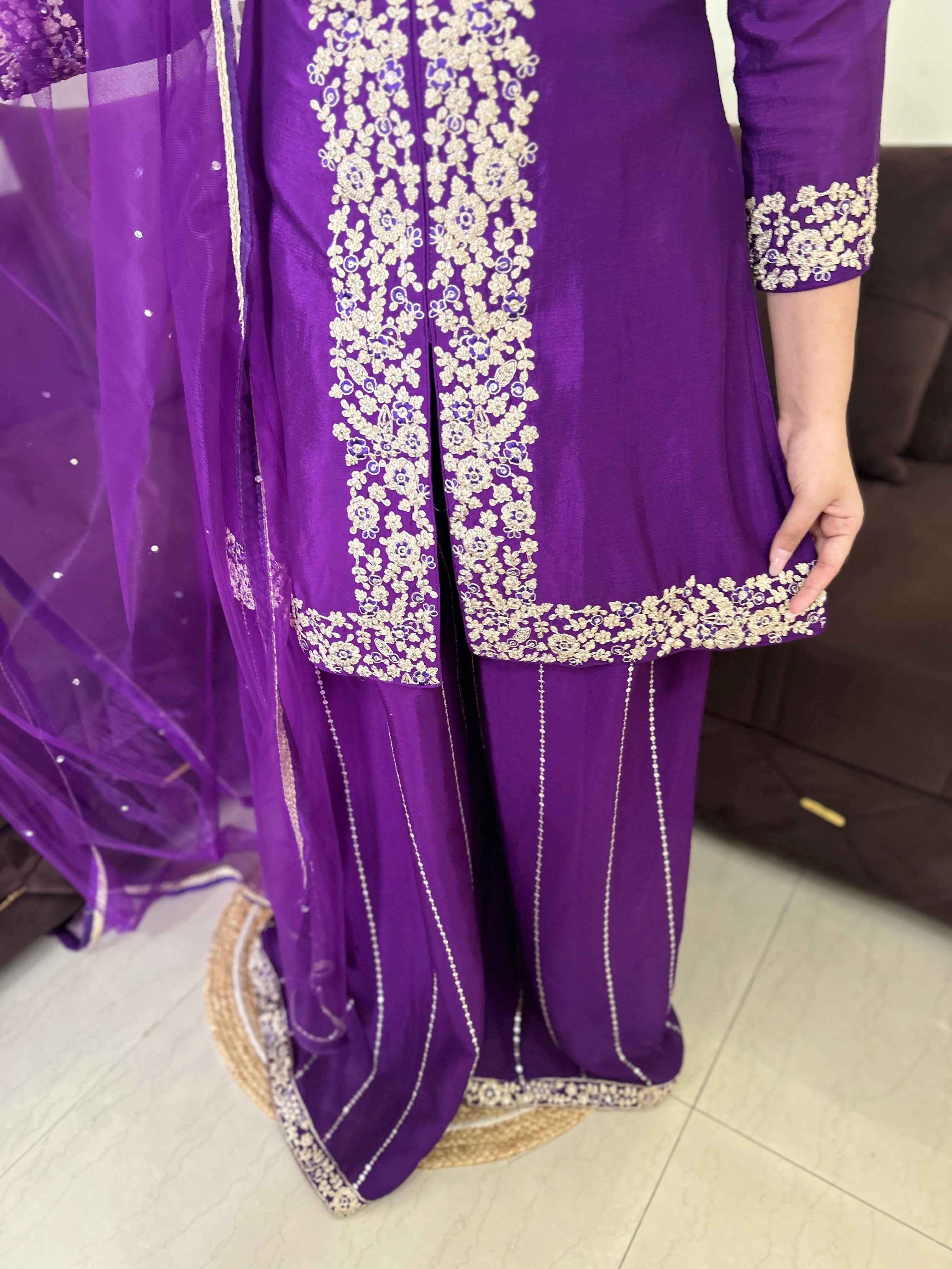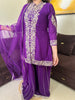 Make a regal statement in this exquisitely crafted Royal Purple Sharara Suit, perfect for festive occasions, weddings, and family celebrations. The set includes a long kameez, flared sharara pants, and a matching net dupatta.